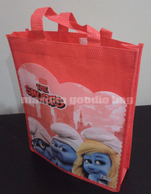 Goodie bag ini jadi salah satu favorit, berbahan dasar kain yang banyak disebut kulit jeruk, karena memang teksturnya menyerupai kulit jeruk. dengan motif gambar karakter Smurf. ukuran goodie bag ulang tahun ini tinggi 33 cm, lebar 27 cm, dan tebal 8 cm.
